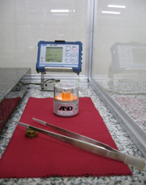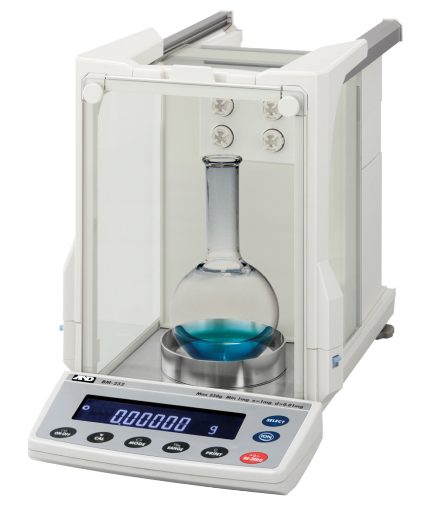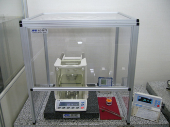 Performance testing of balances at A&D requires that the balance be 1) placed on an anti-vibration table 2) on a stable and rigid bench 3) with a solid foundation. 4) The measurement room must be partitioned off from the rest of the lab and 5) the microbalance must be placed inside an external breeze break to reduce drafts from air conditioning systems. 6) The temperature, humidity, atmospheric pressure, vibrations and wind speed are to be monitored. 7) The balance must be plugged in for approximately one night and a standard weight is used for inspection. Finally taking into consideration the largest source of disturbance, heat from the human body, 8) a special set of 21 cm tweezers must be used to ensure the technician’s hands do not enter the breeze break when confirming repeatability with the 1 g weight.