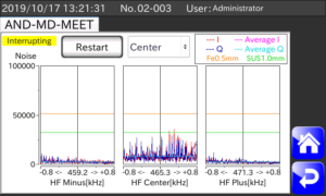 AND Metal Detector Measurement Environment Evaluation Tool provides stable measurement by visualizing noises around the metal detector with a frequency range set by “Auto” set in its display, and by selecting the best frequency to avoid false detection and unstable inspection. This is powerful tool when unknown cause such as randomly activating inverter is disturbing the metal detector resulting in bad performance or false detection.