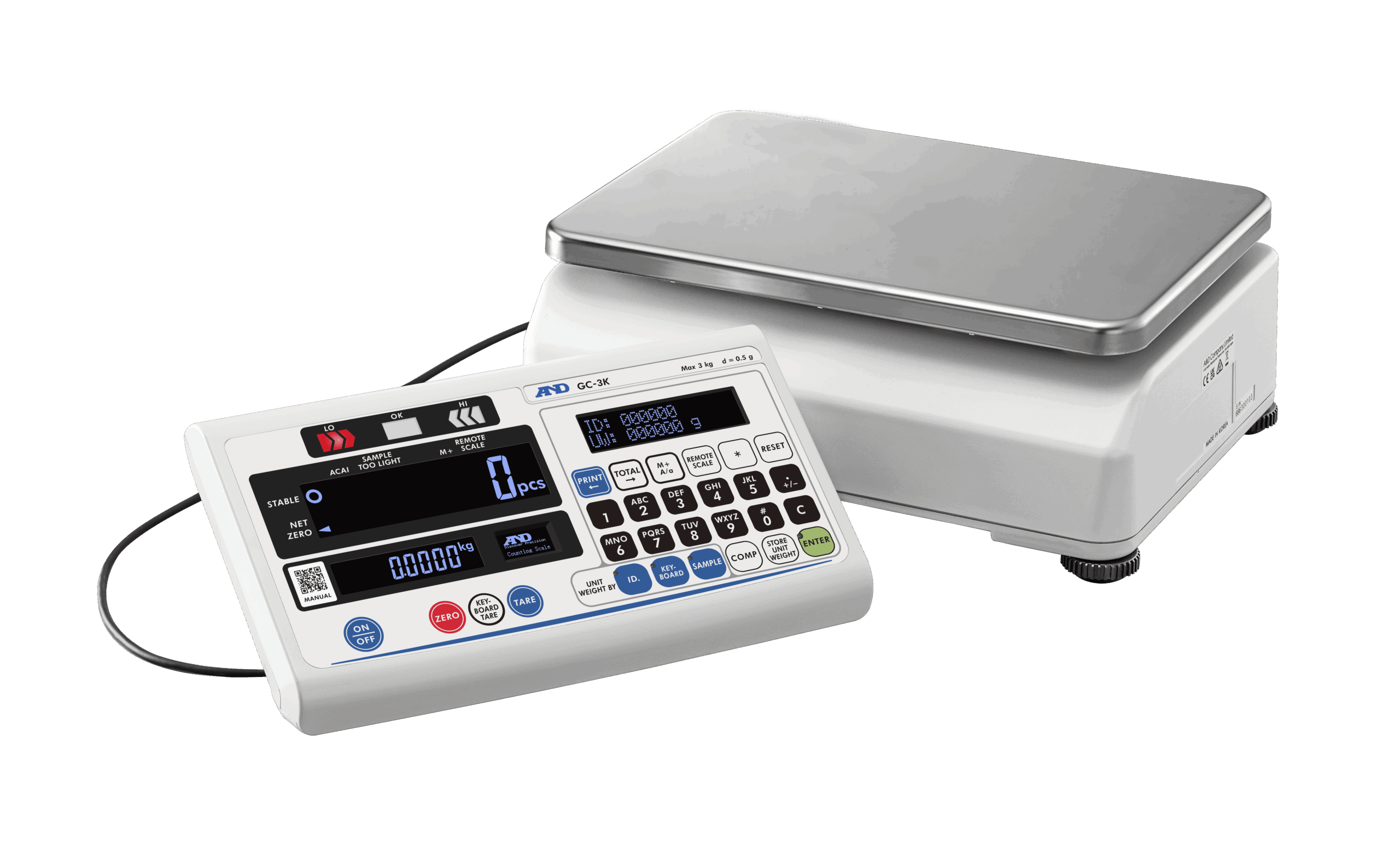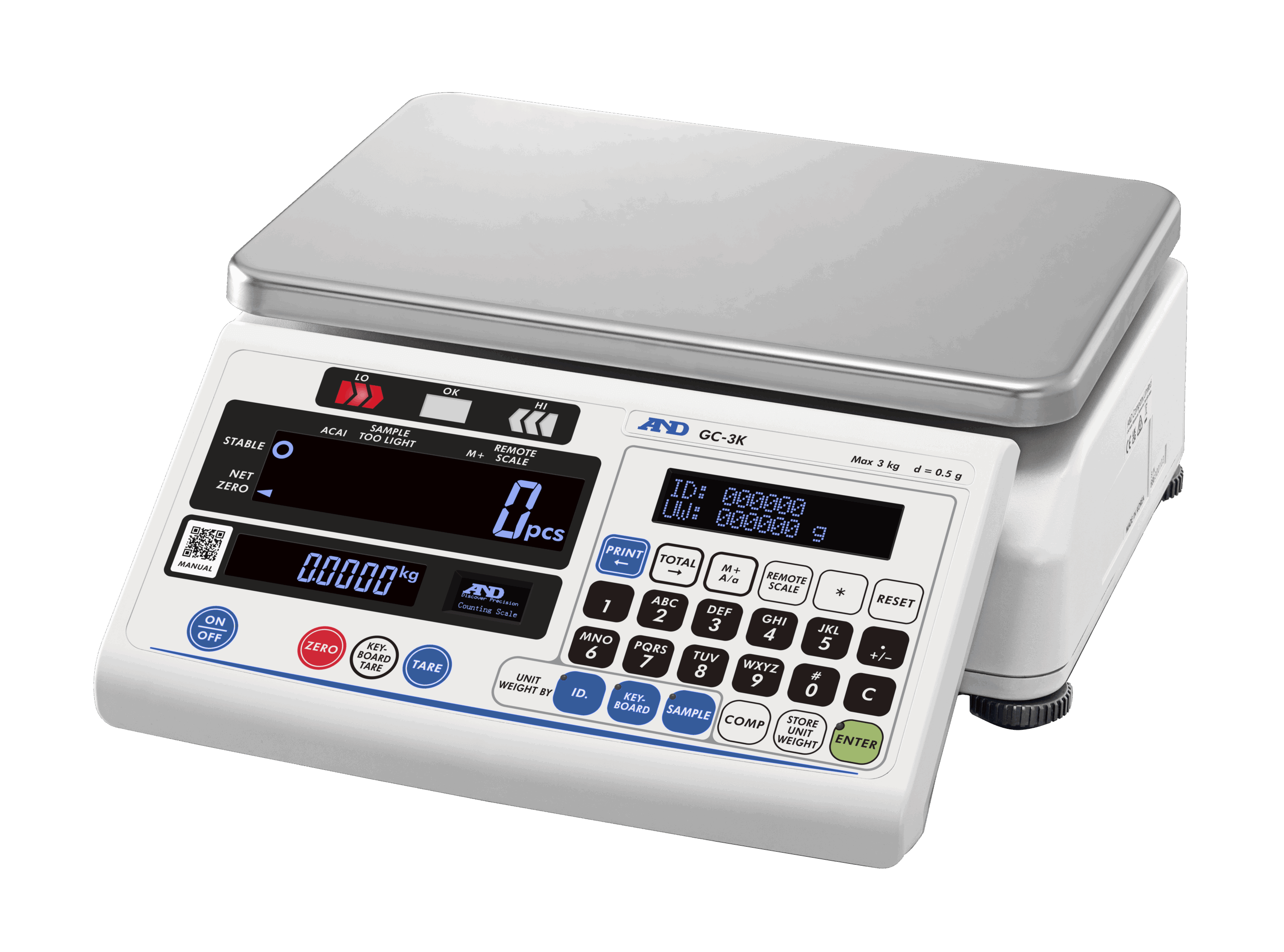 Three reverse-backlit LCD displays for count, weight, and unit weight data, and one OLED information display